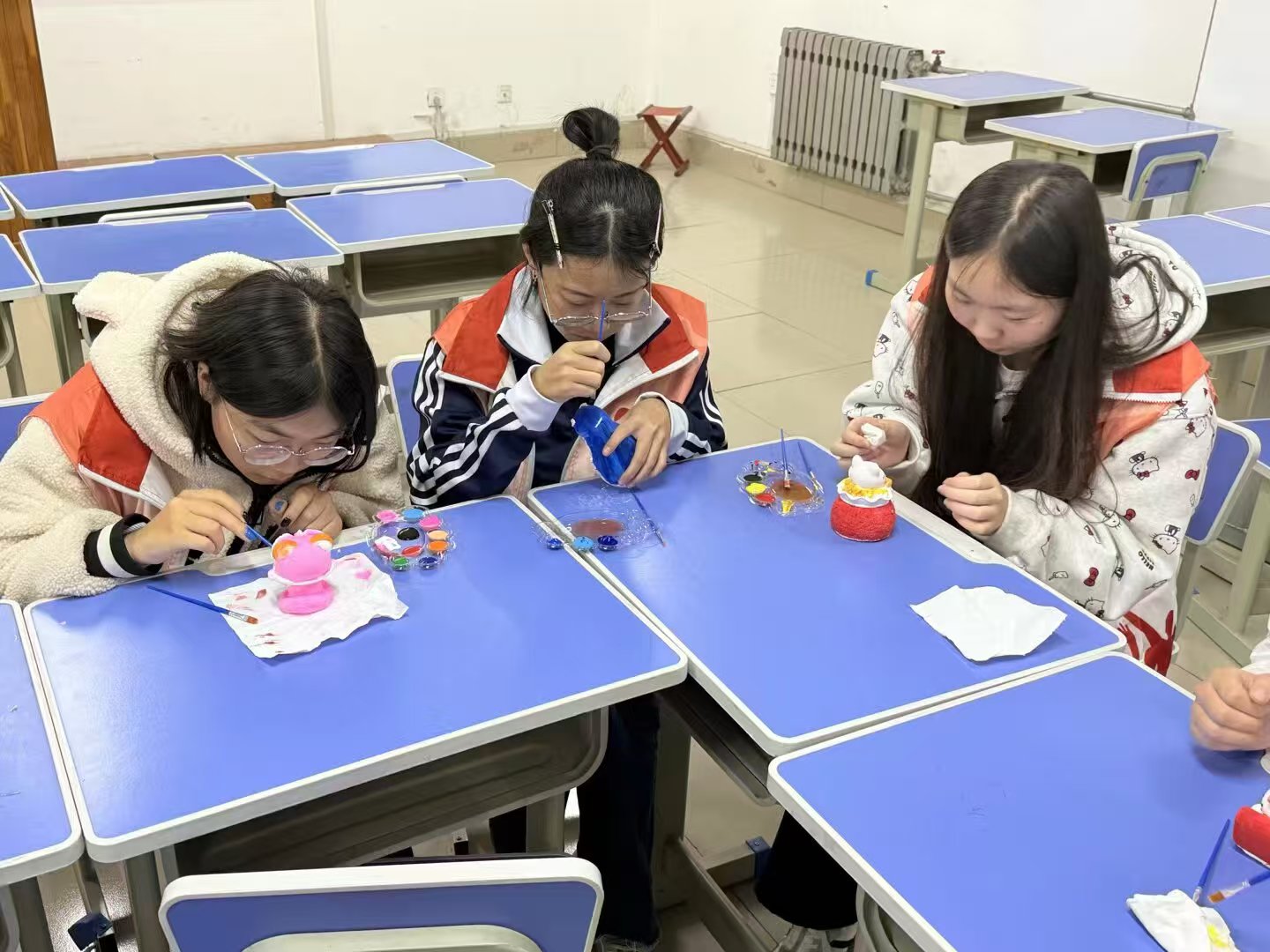 活动现场,学生二至三人为一组,围在桌前进行涂色。他们不局限于卡通形象本身色彩,而是发挥创意与想象力,为石膏娃娃重新进行色彩搭配。他们不时交流配色技巧,分享创作心得,在互动中增进彼此情谊,共同度过一段轻松愉快时光。