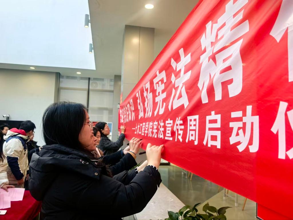 签名铭志:传递法治力量。活动尾声,与会师生有序移步至“普及宪法知识 弘扬宪法精神”主题横幅前,签下自己的姓名。一笔一划,不仅是对宪法的庄严承诺,更是对法治精神的坚定传承。签名后,大家合影留念,镜头定格记录师生们对宪法的敬畏之心和对法治校园的美好憧憬。