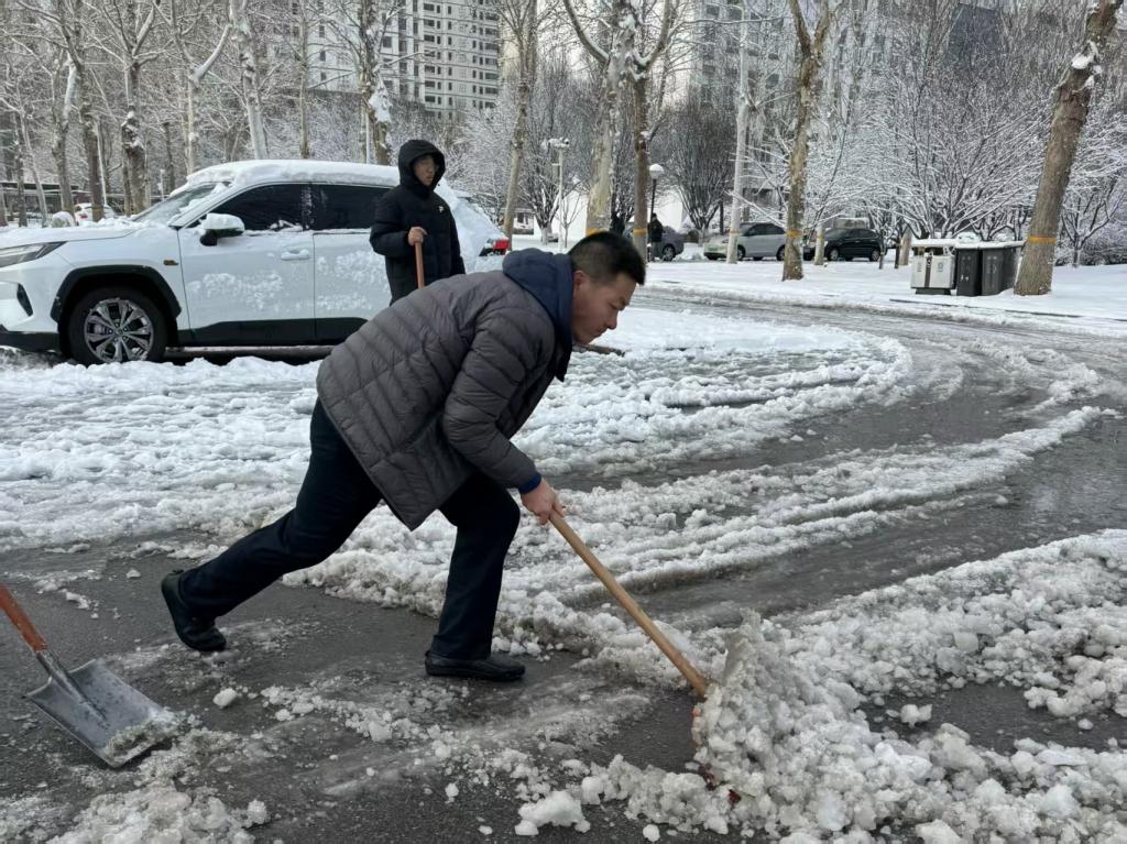 在铲雪现场,教师们率先垂范,他们不畏严寒,一铲一铲地清除着路上的积雪,展现了教育者应有的风范与情怀。志愿者们紧随其后,他们分工明确,有的负责铲除压实的冰块,有的细心清扫路面上的薄雪,还有的负责将堆积的积雪运至指定区域,整个场面忙碌而有序,充满了积极向上的正能量。