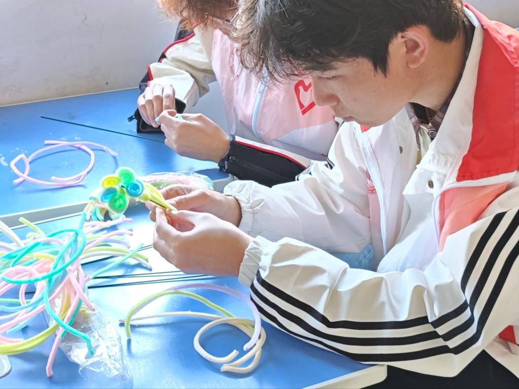 活动当天,志愿者分两组开展活动。一组负责香囊项目,他们在收到材料后,穿针缝合、填装香料;另一组则使用折、拧、绕的方式,借彩色扭扭棒设计多样造型。