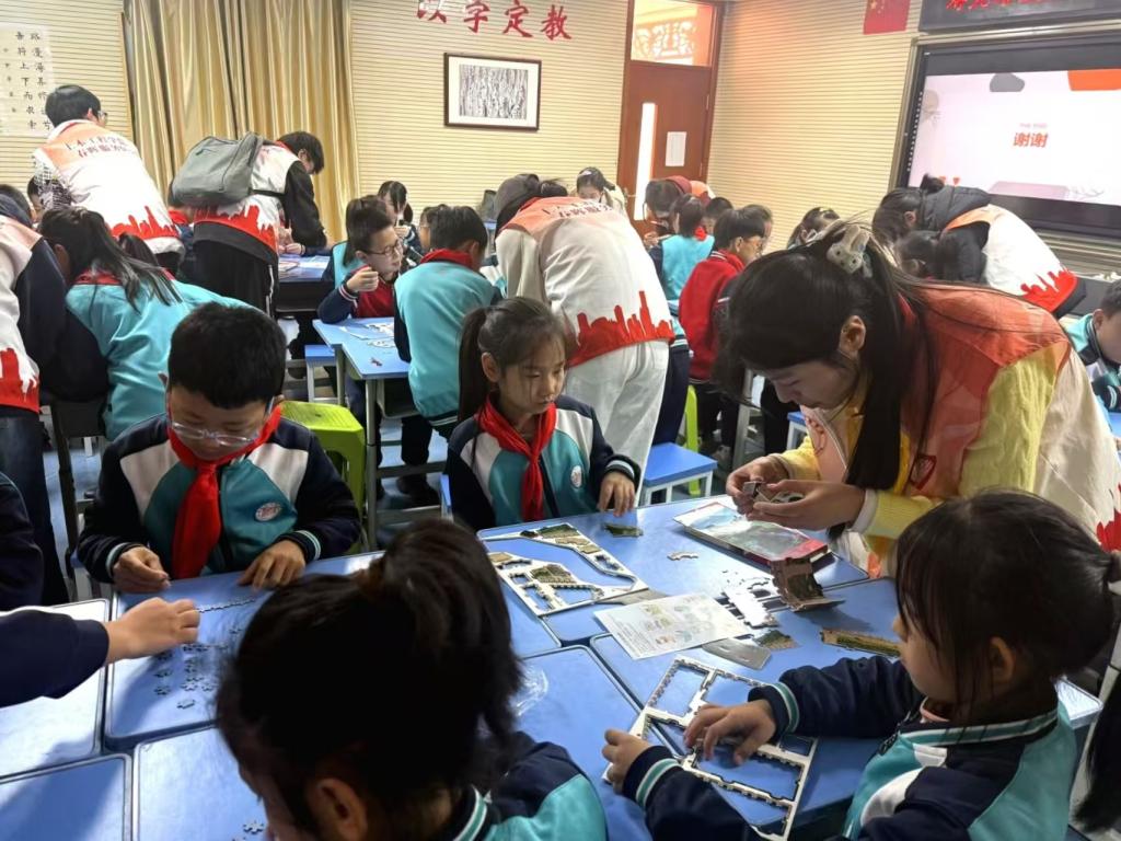 知识宣讲环节结束后,活动进入互动体验阶段。为让孩子更直观感受古建筑巧妙结构,志愿者特别设置了“古建筑主题拼图制作”游戏,规定孩子需以小组合作,动手拼接微缩的亭台楼阁与经典建筑模型。