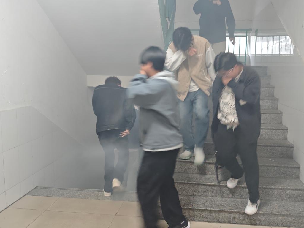本次演练分为应急疏散与消防实操两大环节。在应急疏散演练中,随着警报声响起,学生们迅速做出避险反应,在老师与志愿者的指挥下,双手护头、压低身姿,沿着预定疏散路线,快速、有序地从宿舍撤离至校园安全空旷区域。社区服务中心的志愿者全程协助维持秩序、引导疏散,整个疏散过程紧张有序,未出现拥挤、慌乱现象,有效强化了学生的紧急避险意识和协同疏散能力。